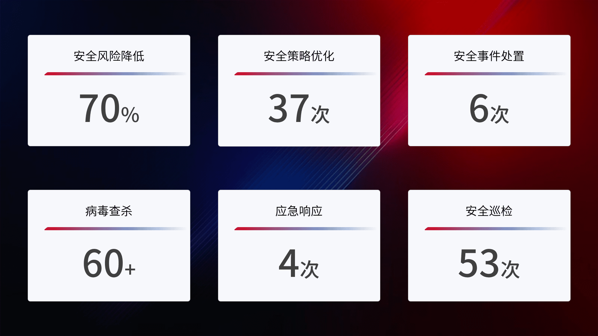 提供全面的安全事件报告体系,,,,包括处置报告、、周报、、季度和年度总结,,,,结合持续监控,,,帮助客户深入了解网络安全状况。。。