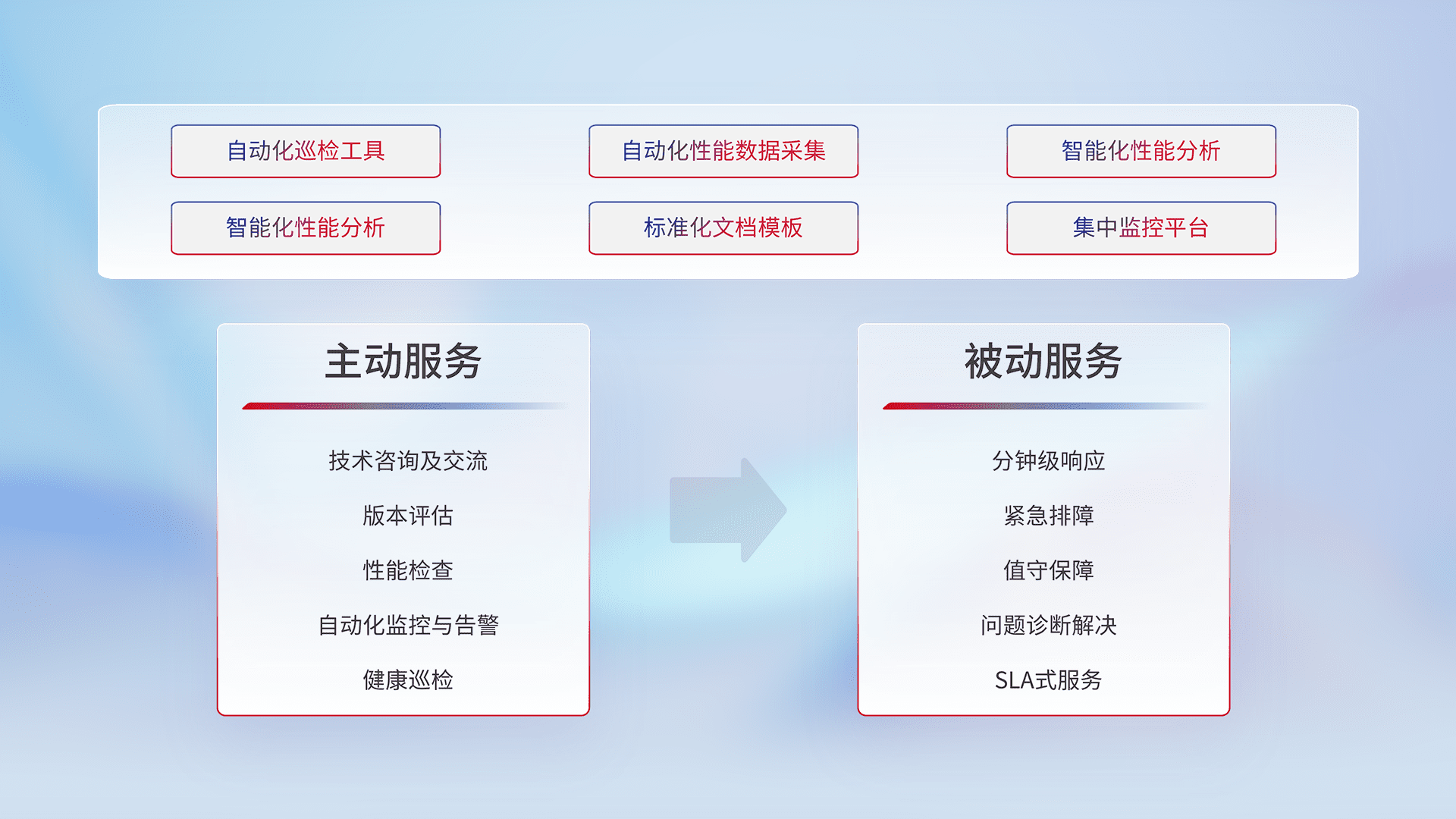 智能化工具和标准化文档,,,,保障服务质量,,,提供主动服务(包含技术咨询、、版本评估、、性能检查、、、、自动化监控与告警、、、健康巡检)和被动服务包含(分钟级响应、、紧急排障、、值守保障、、、问题诊断解决、、、、SLA服务)。。。