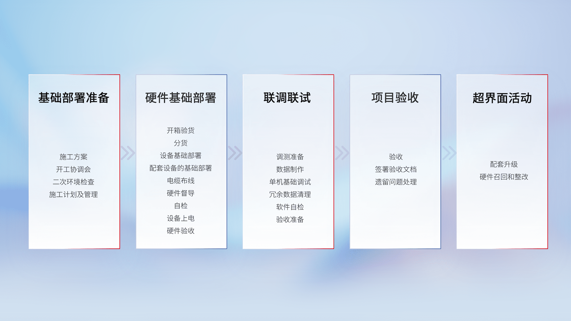 从基础部署准备、、、硬件基础部署、、、、联调联试、、项目验收、、、越界面活动的全过程可追溯,,保证施工质量和进度。。。